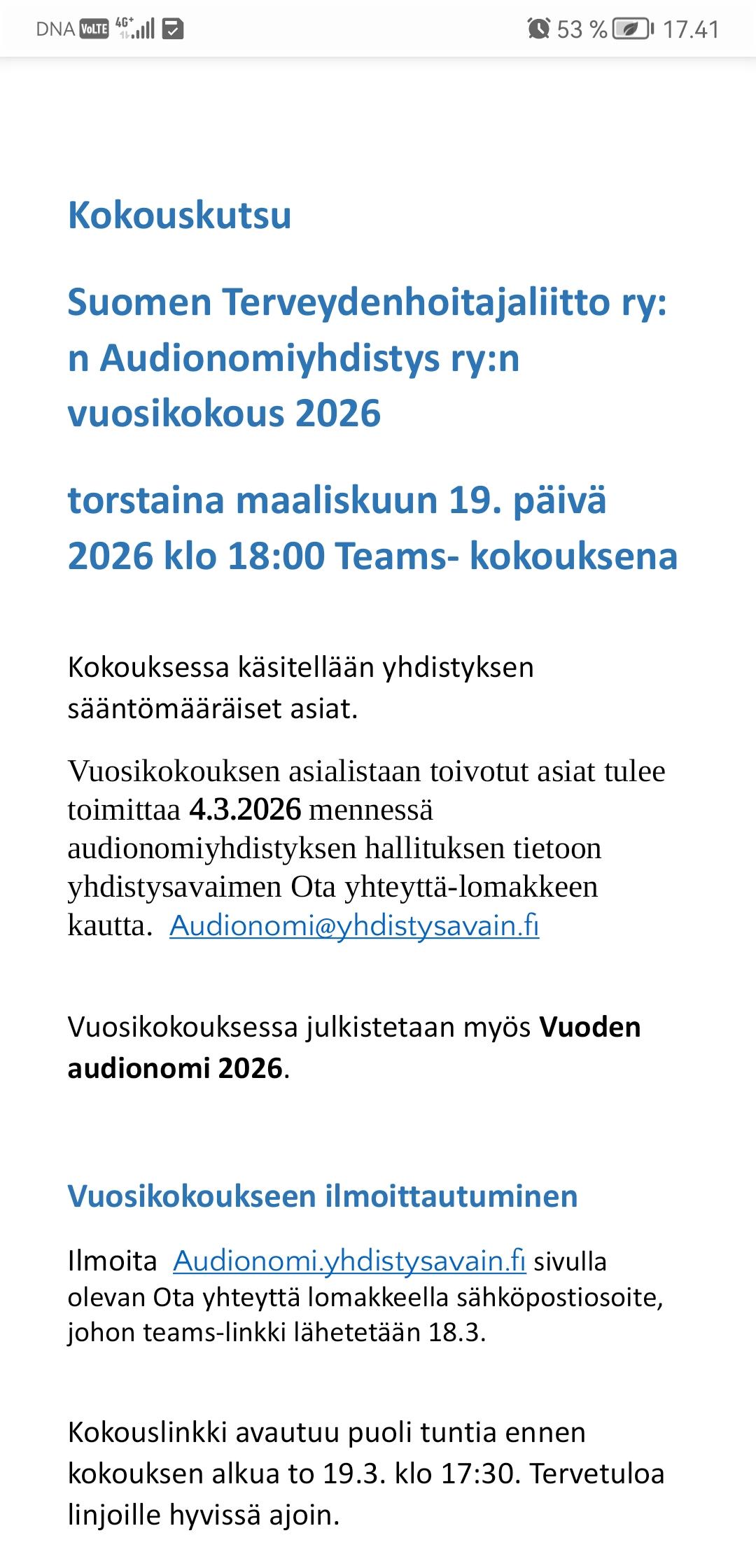 Esitys vuoden audionomista tehdään vapaamuotoisella hakemuksella. Esitykset toimitetaan yhdistyksen hallituksen puheenjohtajalle tapanainenpiia@gmail.com 28.2.2026 mennessä. Vuoden audionomi julkistetaan yhdistyksen vuosikokouksessa 19.3.2026 ja juhlistetaan vielä syksyn 2026 audionomipäivillä. 😊